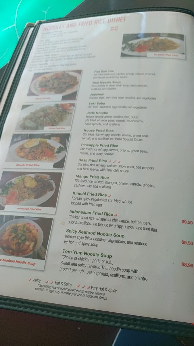 Very hot & spicy. Stir fried rice w/ egg, onions, snow peas, bell peppers and basil leaves with Thai chili sauce.